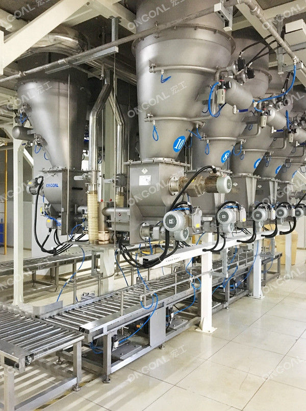 主要原輔材料根據操作計劃要求的品種和數量,通過無塵給料站直接放入倉內。稱量后,料倉通過電梯移至配料站,或將原料、輔料放入無塵進料站,通過真空輸送機送至配料站內固定的料倉;