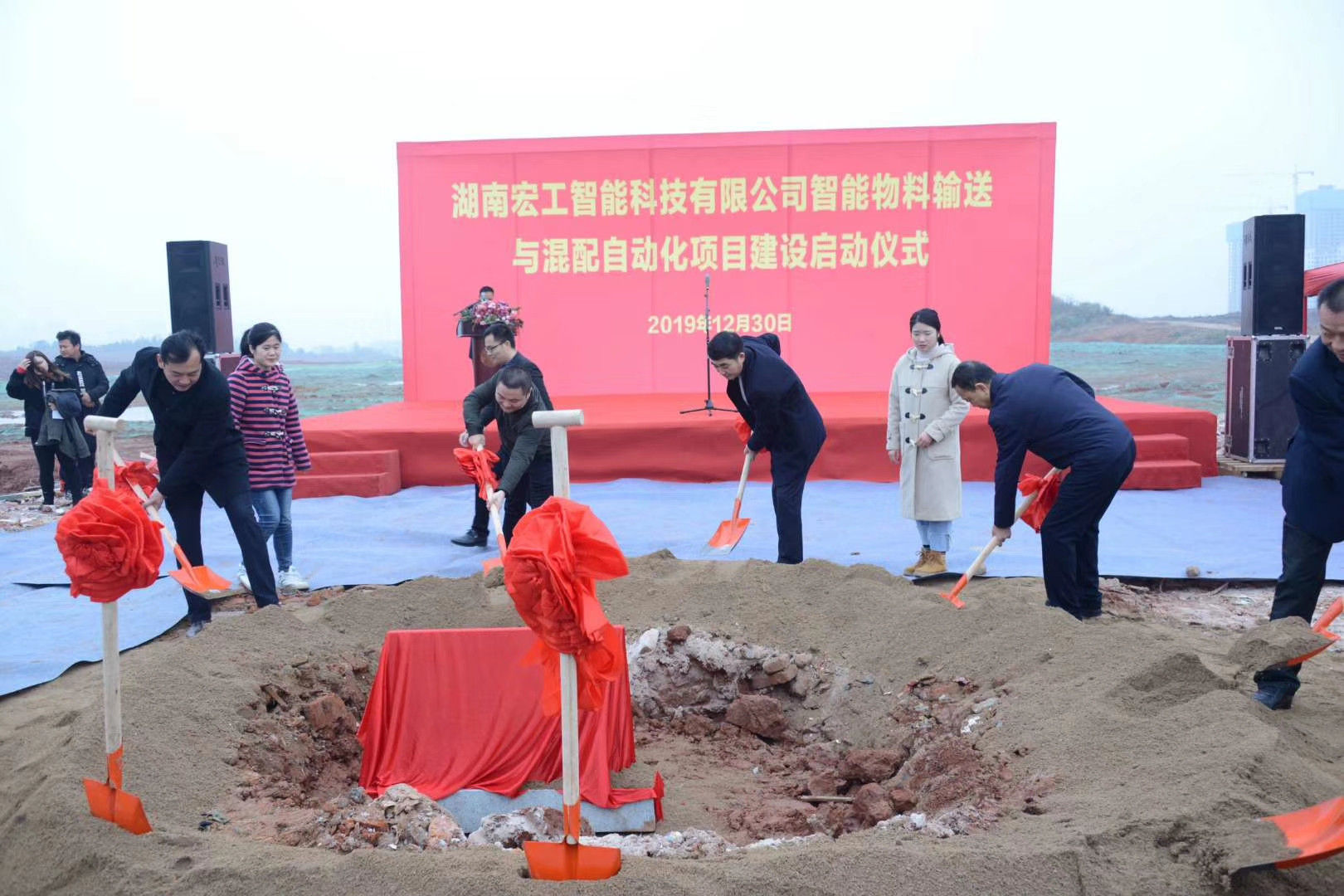 2019年12月30日上午9時許,湖南宏工智能科技有限公司株洲產業園區開工奠基典禮在天元區順利舉行。株洲市高新區管委會主任朱振湘、副主任陳遠瑞、株洲高科集團董事長巢亮、總經理王洪宇、副總經理羅文斌、廣東宏工自動化系統有限公司董事長羅才華、副總經理余子毅、運營及人力資源總監朱戰鵬出席并參加了園區奠基儀式。